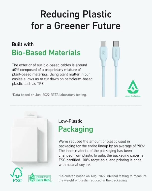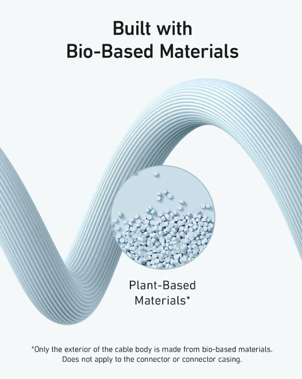 • يتكون الجزء الخارجي من الكابلات القائمة على أساس حيوي بنسبة 40 ٪ تقريبًا من خليط خاص من المواد النباتية.