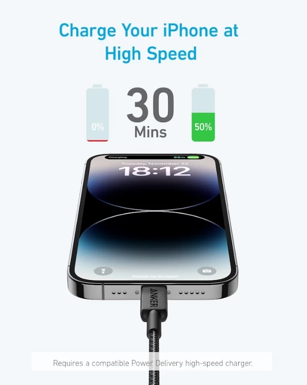 Anker 322 USB-C to Lightning Cable Braided (0.9m/3ft) -Black A81B5H11